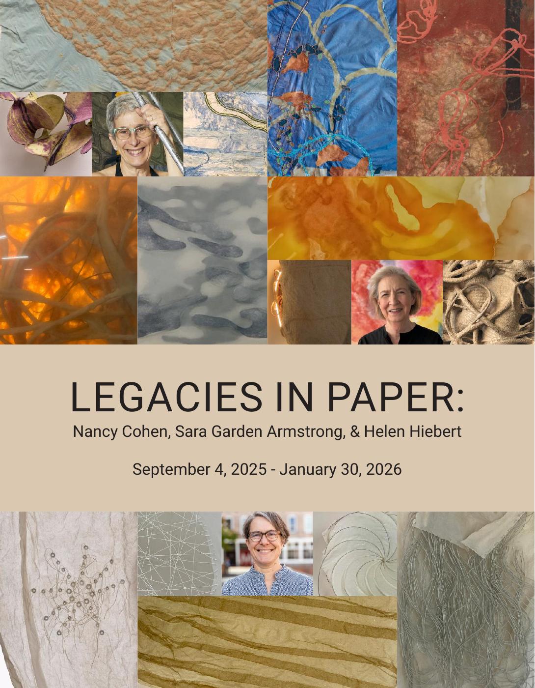 Legacies in Paper is an exhibit celebrating the lifelong exploration of hand paper making in the artworks of Nancy Cohen, Sara Garden Armstrong, and Helen Hiebert, significant pioneers in developing paper as an artistic and sculptural medium. Through their hands, paper becomes a language of memory, a vessel of emotion, and a bridge between past and present.